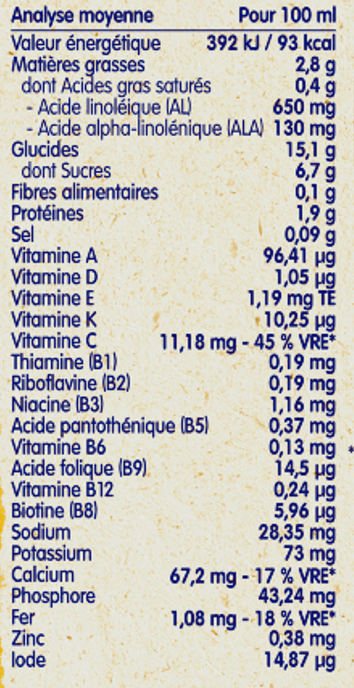 Ingrédients : Lait écrémé 46,1 % (LAIT) - Eau - Maltodextrine - Huiles végétales [colza, tournesol, palme (SOJA)] - Farine [blé 2,4% (GLUTEN), riz 0,05 %] - Sucre - Amidon de maïs - Lait écrémé en poudre 0,8 % (LAIT) - Lactose (LAIT) - Lait entier en poudre 0,3 %(LAIT) - Caramel (sucre, eau) - Correcteurs d'acidité : hydroxyde de potassium, carbonate de calcium - Emulsifiant : lécithine de soja (SOJA) - Arôme - Minéraux (bicarbonate de sodium, pyrophosphate ferrique, sulfate de zinc, iodure de potassium) - Vitamines (A,B1, B2, B3, B5, B6, B8, B9, B12, C, D3, E, K1).