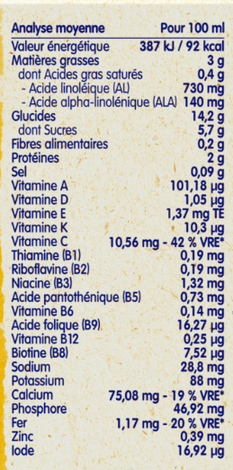 Ingrédients : Lait écrémé 44 % (LAIT) - Eau - Maltodextrine - Farine [blé 2,8 % (GLUTEN), riz 0,04 %] - Huiles végétales [colza, tournesol, palme (SOJA)] - Sucre - Amidon de maïs - Lactose (LAIT) - Lactosérum déminéralisé (LAIT) - Correcteurs d'acidité : carbonatede calcium, hydroxyde de potassium - Arôme - Emulsifiant : lécithine de soja (SOJA) - Minéraux (bicarbonate de sodium, pyrophosphate ferrique, sulfate de zinc, iodure de potassium) - Vitamines (A, B1, B2, B3, B5, B6, B8, B9, B12, C, D3, E, K1).