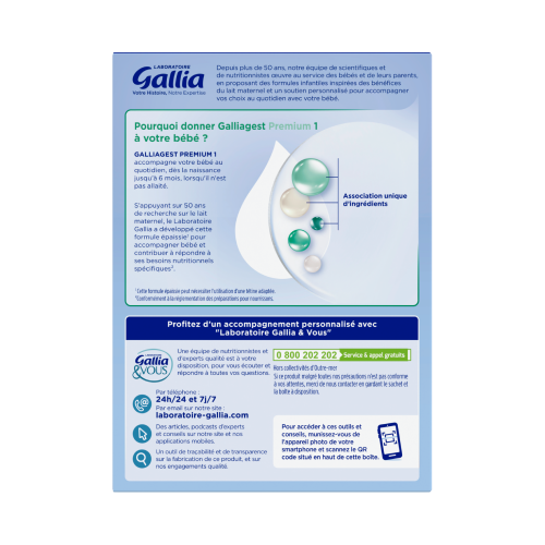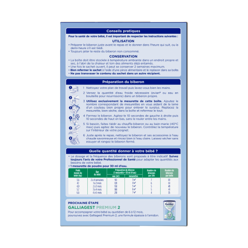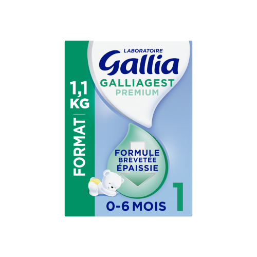 Format 1,1kg : 2 sachets de 550gProchaine étape, pour accompagner votre bébé au quotidien de 6 à 12 mois, poursuivez avec Galliagest PREMIUM 2, une formule épaissie à l'amidon