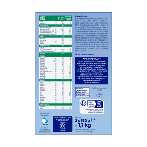 Avis Important : Le lait maternel est l'aliment idéal et naturel du nourrisson. Toutefois, si vous ne pouvez pas ou ne souhaitez pas allaiter, le Corps Médical vous conseillera une préparation infantile répondant aux besoins nutritionnels spécifiques de votre enfant. Ce produit convient à l'alimentation de votre bébé, n'en changez pas sans demander l'avis de votre médecin.