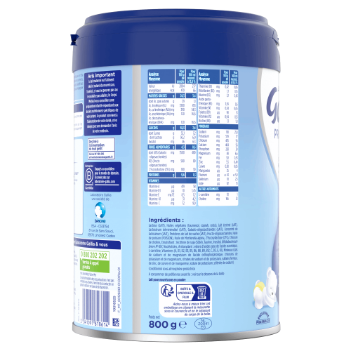 Ingrédients : Lactose (LAIT), Huiles végétales (tournesol, coprah, colza), Lait écrémé (LAIT), Lactosérum déminéralisé (LAIT), Galacto-oligosaccharides (LAIT), Concentré de lactosérum (LAIT), Protéines de lait de vache (LAIT), Fructo-oligosaccharides, Huile de poisson (POISSON), Huile de Mortierella alpina, 2'Fucosyllactose (2'FL), Chlorure de choline, Emulsifiant : lécithine de soja (SOJA), Taurine, Inositol, Bifidobacterium breve M-16V, Nucléotides, Antioxydant : esters d'acides gras de l'acide ascorbique, L-carnitine, Vitamines (A, B1, B2, B3, B5, B6, B8, B9, B12, C, D3, E, K1), Minéraux (sels de calcium et de magnésium de l'acide orthophosphorique, chlorures de potassium et de magnésium, citrates de sodium et de potassium, sulfates de fer, de zinc, de cuivre et de manganèse, iodure de potassium, sélénite de sodium)